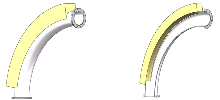 一般采用的背包式彎頭是由普通彎頭和扣接于彎頭外壁處的填充背包組成。物料在長(zhǎng)期使用中將填充物磨掉,將有物料進(jìn)入填充腔內(nèi),物料將會(huì)與物料進(jìn)行摩擦,減少物料對(duì)彎頭處的磨損。使彎頭的使用周期大大增加,減少更換和修補(bǔ)耐磨彎頭的次數(shù)。